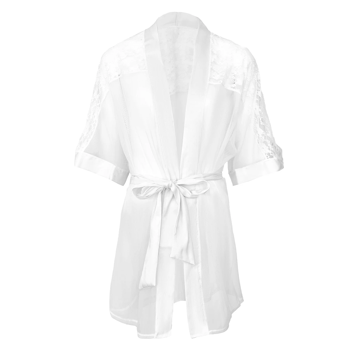 Bata corta color blanco translucida para dejar ver tus conjuntos JF. Realizada en denier, satén y encaje. Súper delicada.