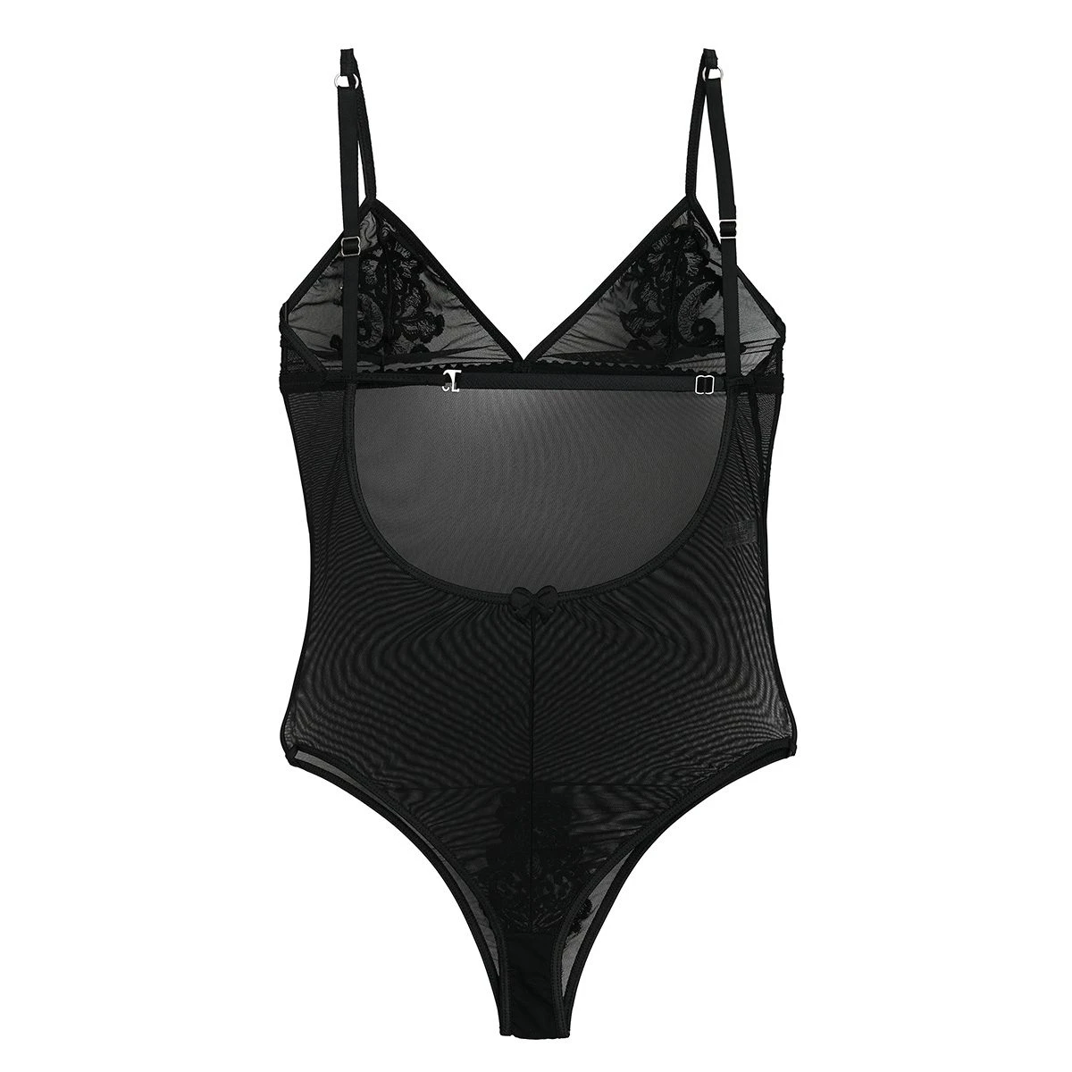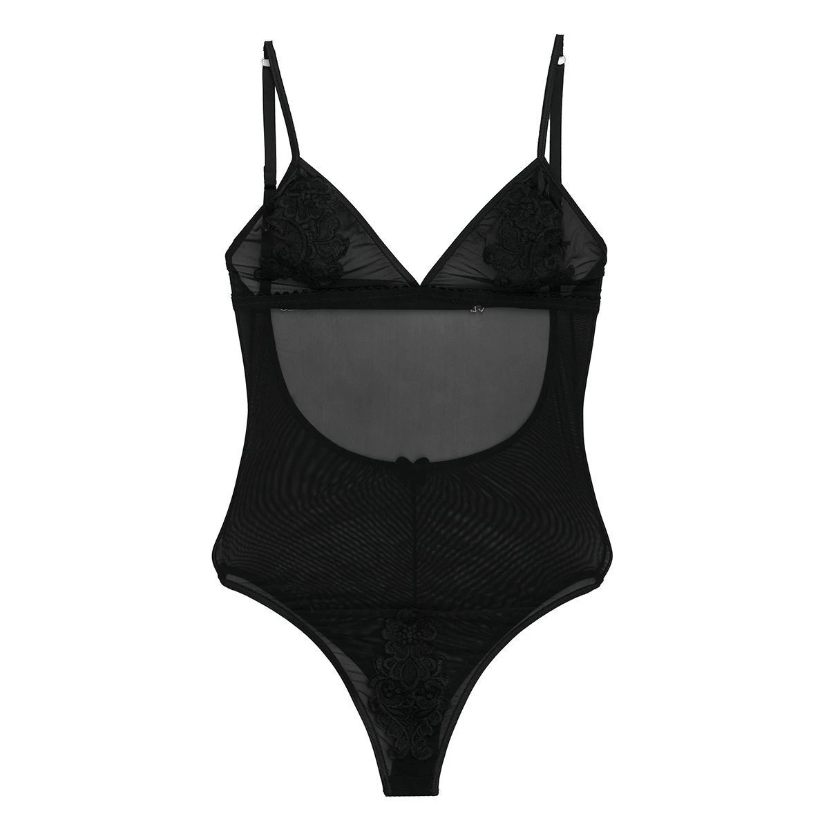 Body realizado en tul elastizado con apliques bordados de guipure. Espalda y breteles regulables.