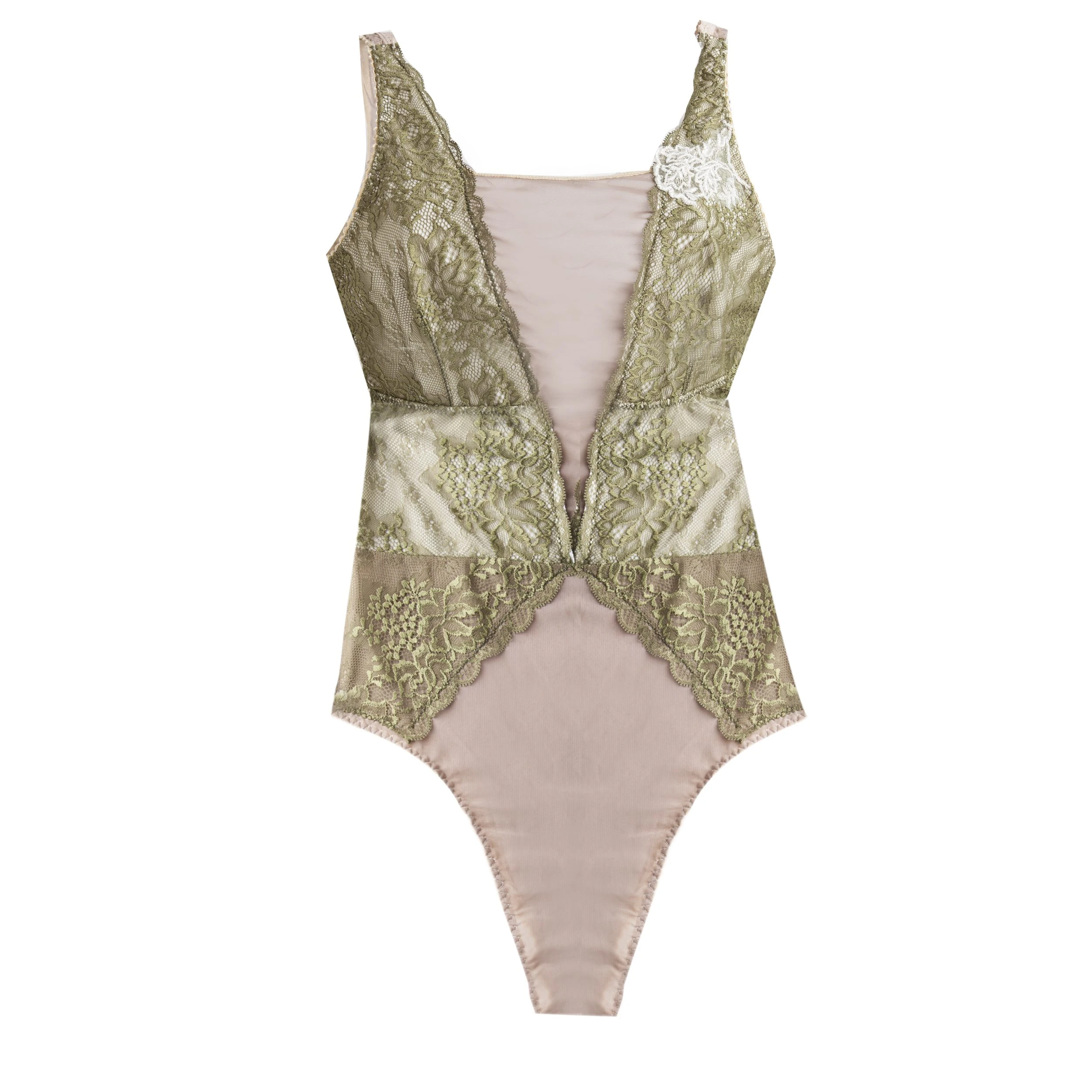Body de puntilla y tul. Es una prenda sin breteles. Tiene un escote de transparencia de tul y una espalda en v pronunciada. Cuenta con broche de belur de 3 posiciones para un facil acceso. En una de las tazas tiene un hermoso aplique como decoración.