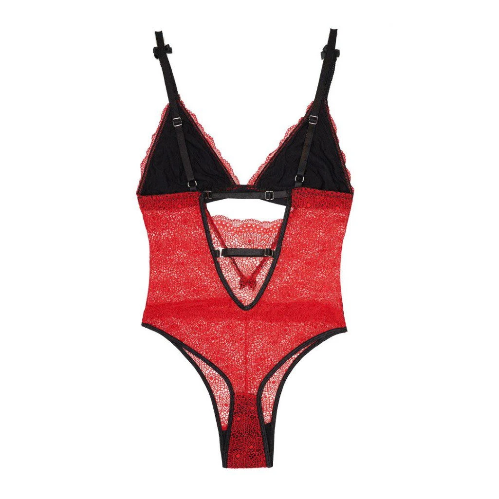 Body: de puntilla con busto triangulo forrado en algodón. Cuenta con breteles regulables. La espalda cuenta con dos breteles regulables desmontables. Detalles de puntilla fina rígida en los inicios de breteles y con decoración de moños en las terminaciones. La parte trasera es less y la materialidad es de puntilla.