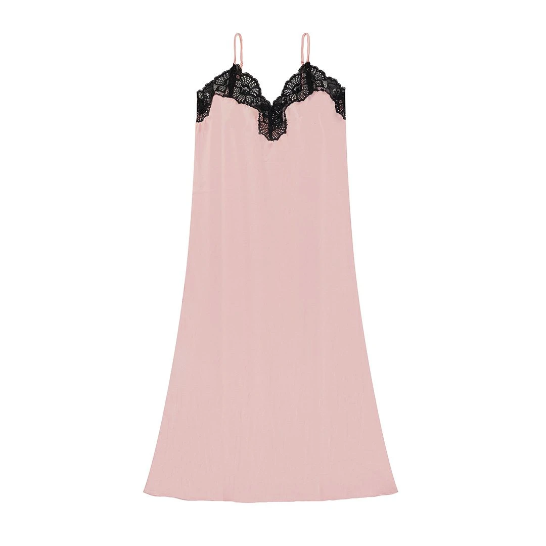 Sumérgete en el lujo con nuestro camisón largo, elaborado en suave satén y delicada puntilla. Esta versátil prenda no solo realza tu intimidad, sino que también se transforma en un elegante vestido lencero.