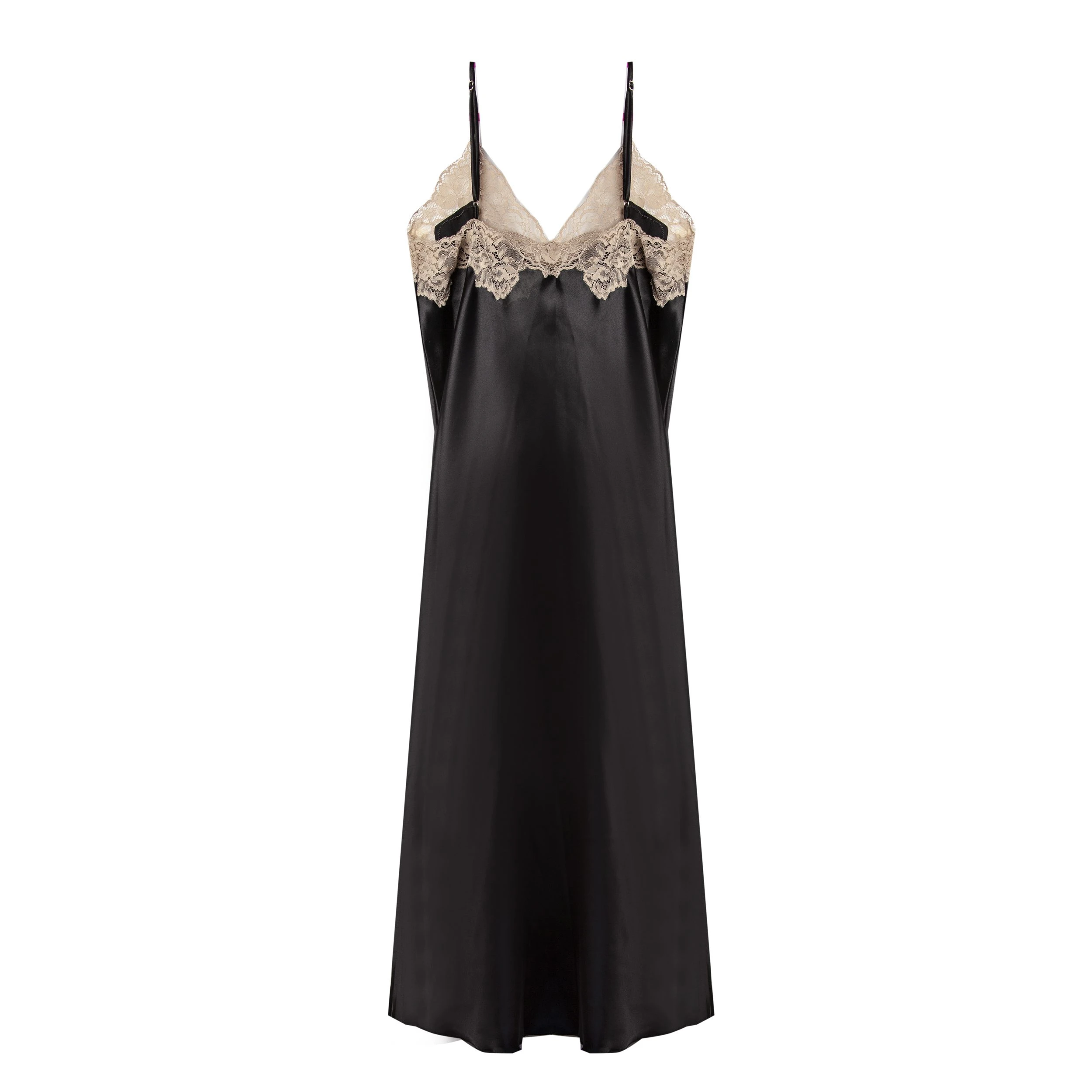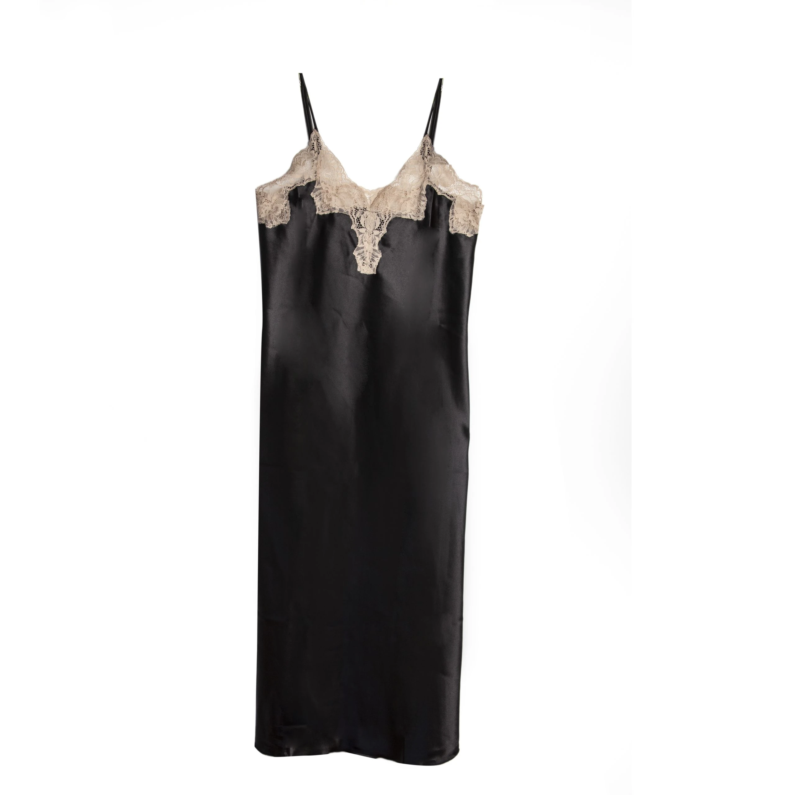 Sumérgete en el lujo con nuestro camisón largo, elaborado en suave satén y delicada puntilla. Esta versátil prenda no solo realza tu intimidad, sino que también se transforma en un elegante vestido lencero.