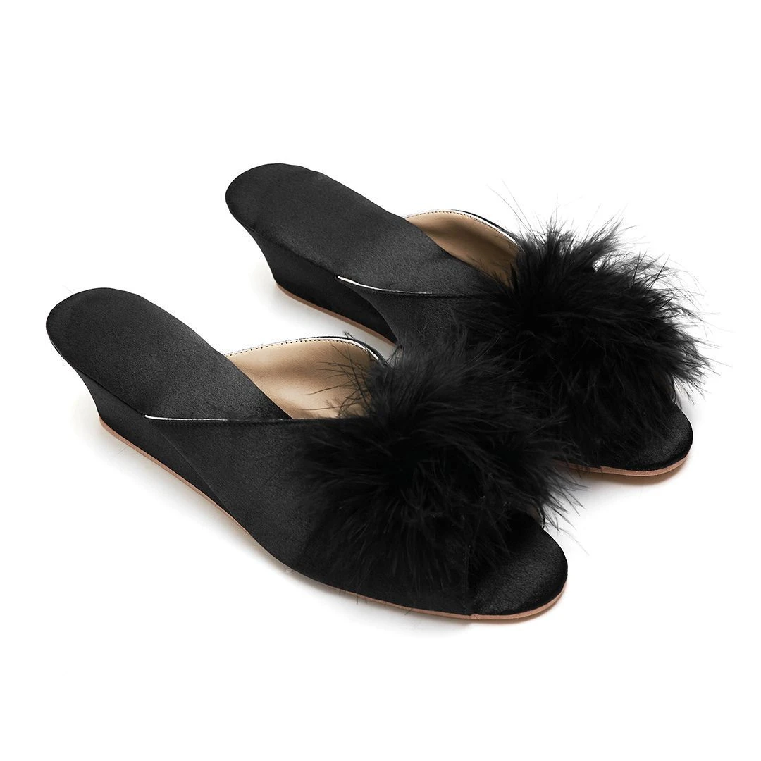 Chinelas taco chino forradas en satén con detalle de pompón.