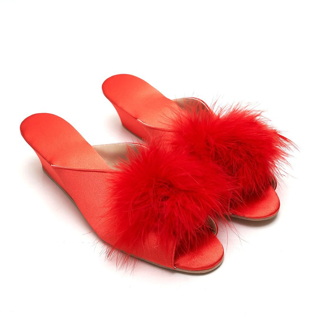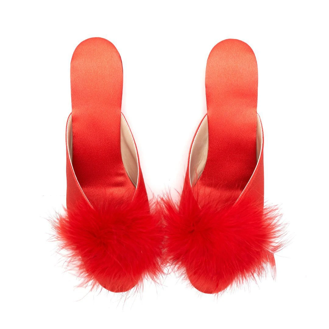 Chinelas taco chino forradas en satén con detalle de pompón.