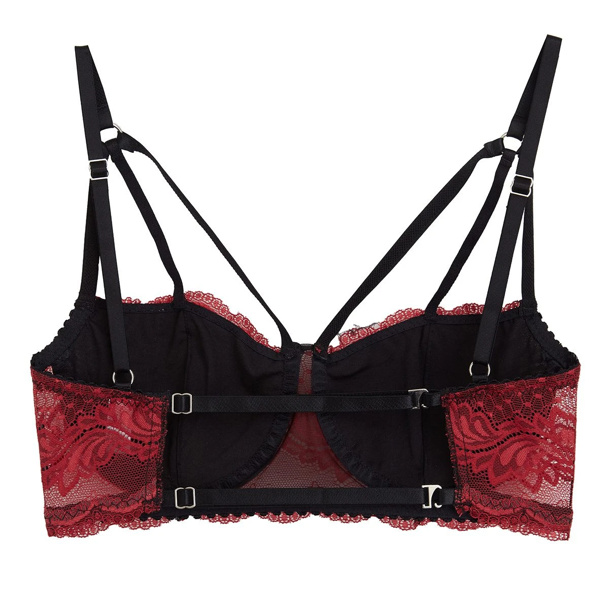 Conjunto de corpiño con arco de puntilla forrado con algodón, en una de las tazas cuenta con un aplique de puntilla de una flor. En el escote cuenta con tres breteles en cada lado y luego puntilla y tul. Espalada regulable. Microbikini regulable congeccionada con puntilla y microtul.