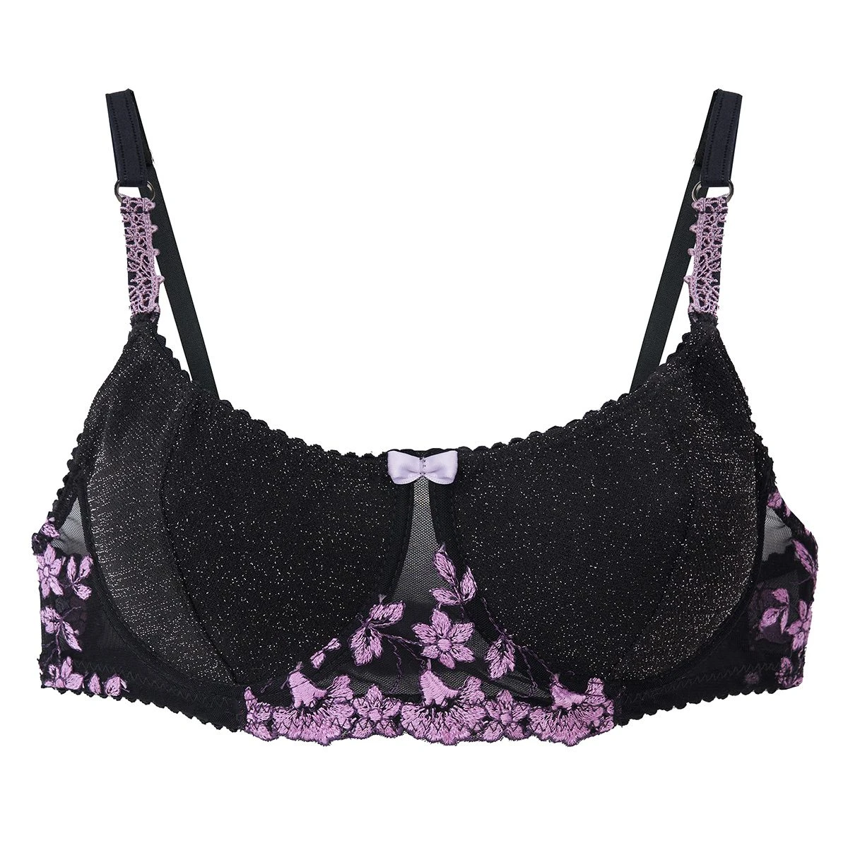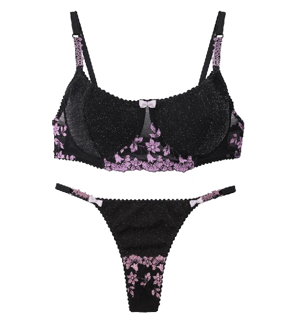 Conjunto de corpiño con arco confeccionado artesanalmente en lurex forrado y tul bordado suizo en las coletas ,en combinación . Cuenta con breteles regulables que tienen de modo decorativo en los inicios un galón bordado. Microbikini less confeccionada en lurex en la parte superior y en la parte inferior de tul bordado. Cuenta con breteles regulables que tienen de modo decorativo en los inicios, un galón bordado y un moño en cada extremo. Trasero de denier.