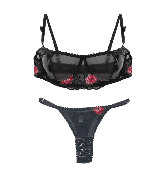 Conjunto de corpiño con arco confeccionado en vinilo y tul en las tazas. En la coleta cuenta con una combinación de tul bordado suizo y tul. Breteles regulables y espalda desmontables. Microbikini de tul en la parte superior con aplique bordado y de vinilo en la parte inferior de la prenda. Trasero less de tul. Cuenta con breteles regulables.