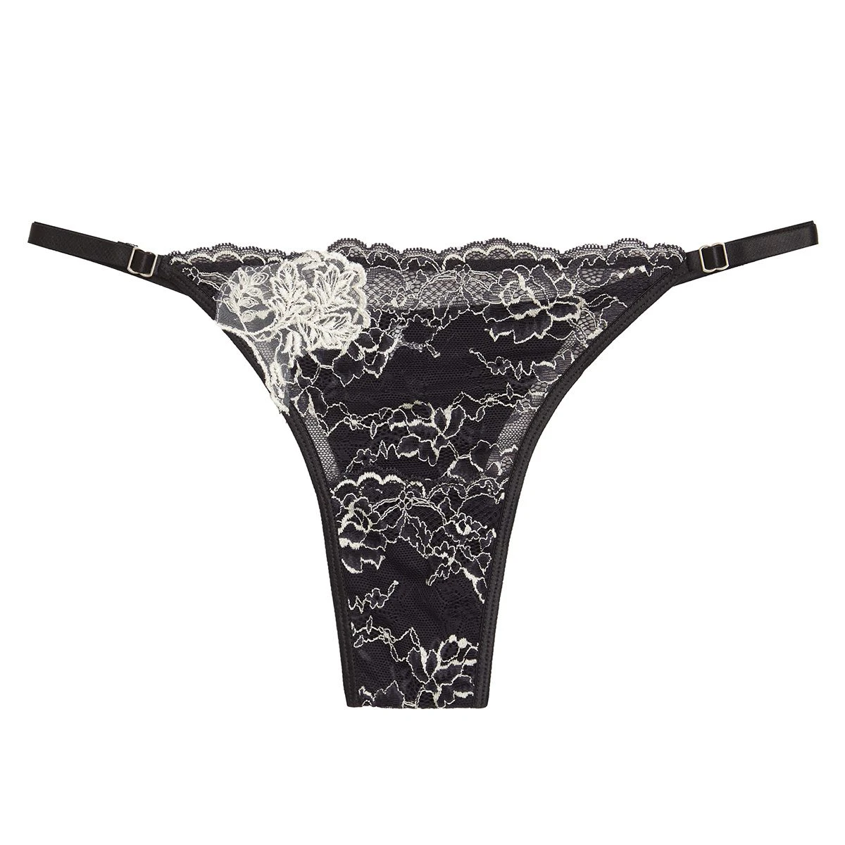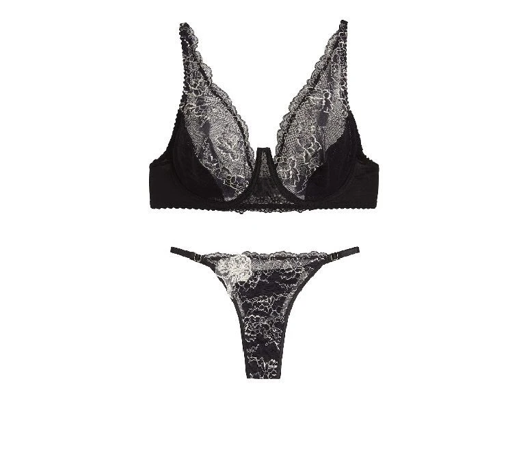 Conjunto de corpiño con arco, cuenta con un escote sensual pronunciado . Confeccionado artesanalmente en puntilla bicolor, powernet y tul bordado suizo . Lo acompaña microbikini regulable a juego.
