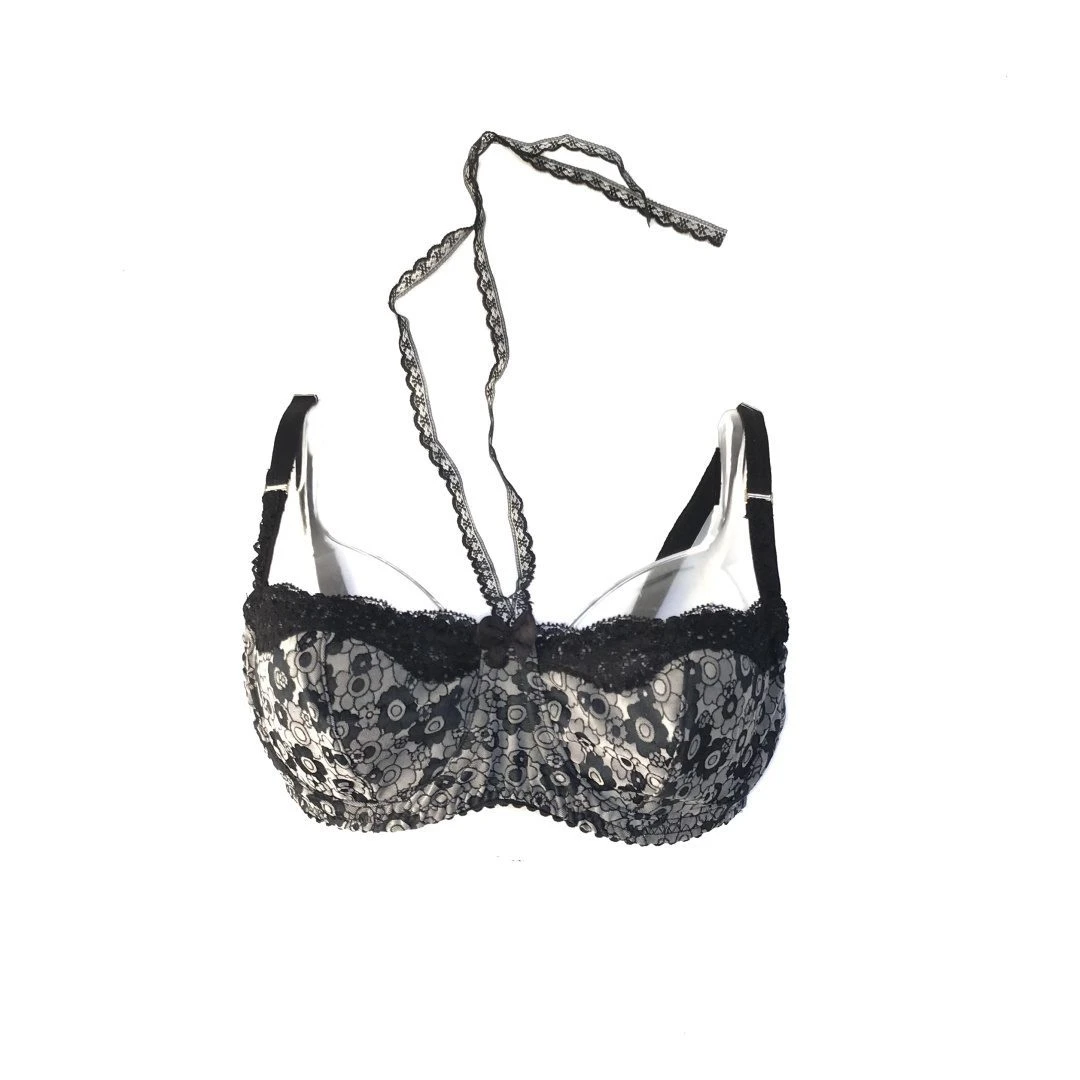 Conjunto de soutien con arco confeccionado en puntilla y jacquard italiano. Es divino con su detalle de cuello y corte balconette. Lo acompaña microbikini en jackard italiano haciendo juego.