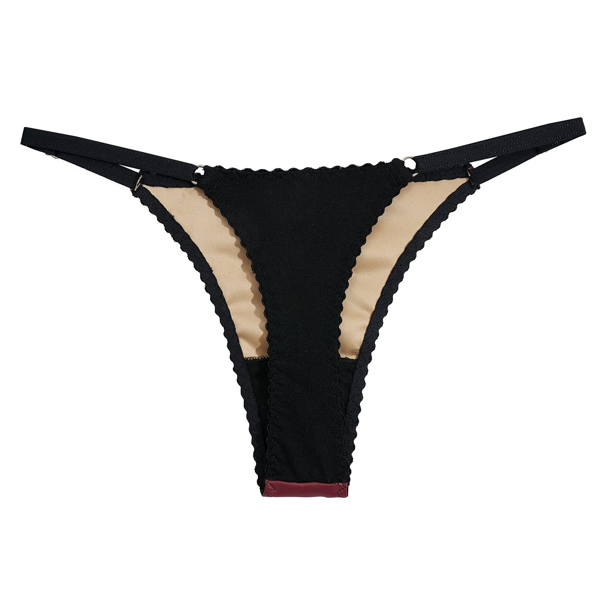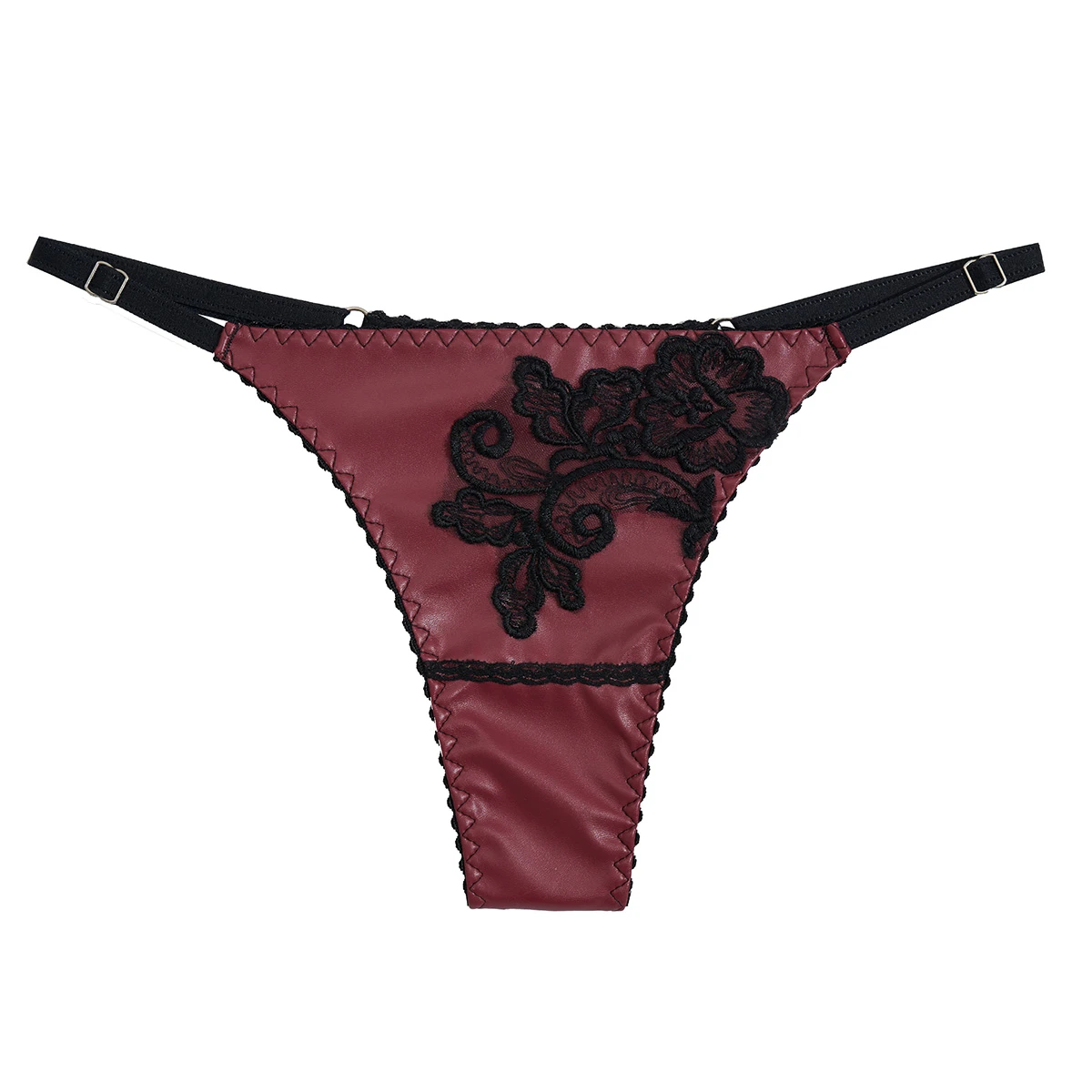 La microbikini acompaña el look con un toque provocador: ecocuero al frente y less de denier atrás, más un delicado aplique bordado que completa la apuesta.