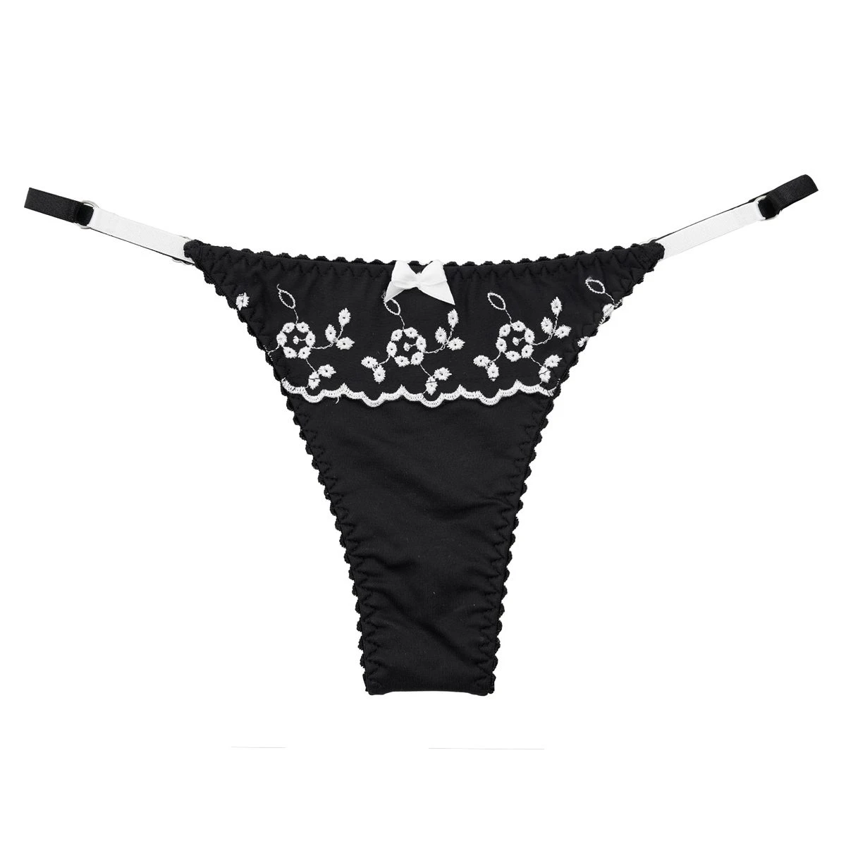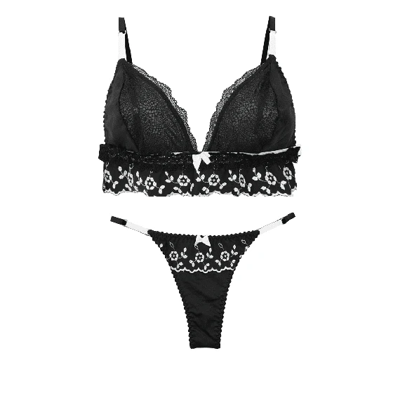 Conjunto de corpiño triangulo forrado en denier , confeccionado en microfibra bordada y lycra. Breteles regulables que tienen de modo decorativo en los inicios una trabita de bretel a contratono. El bajo busto es regulable para adaptarse a diferentes contornos. Microbikini regulable confeccionada en microfibra bordada y lycra.