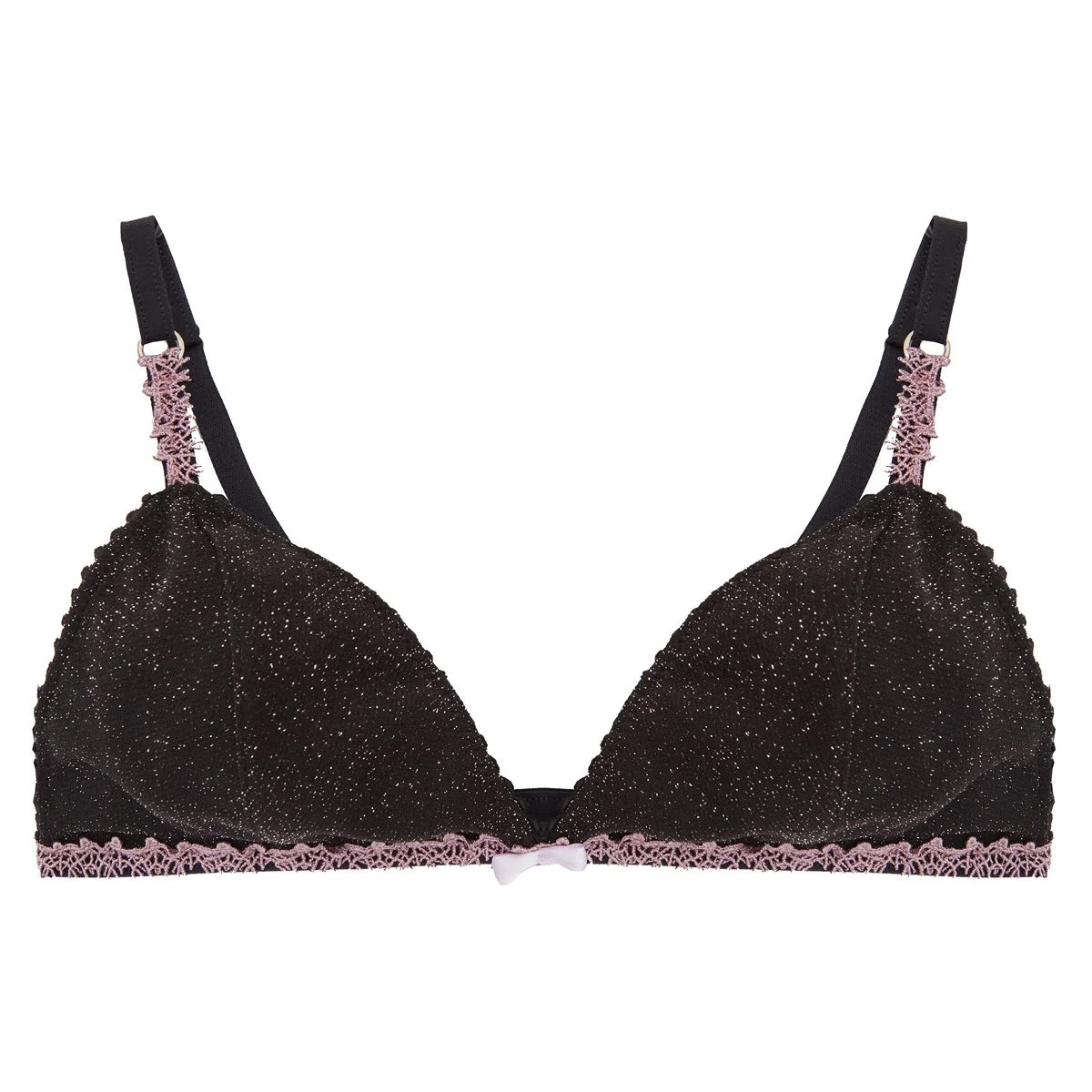Conjunto de lurex, un genero con un leve brillo muy fino y sofisticado. Acompaña la bombacha cola less regulable. Laterales con delicados detalles de moños.