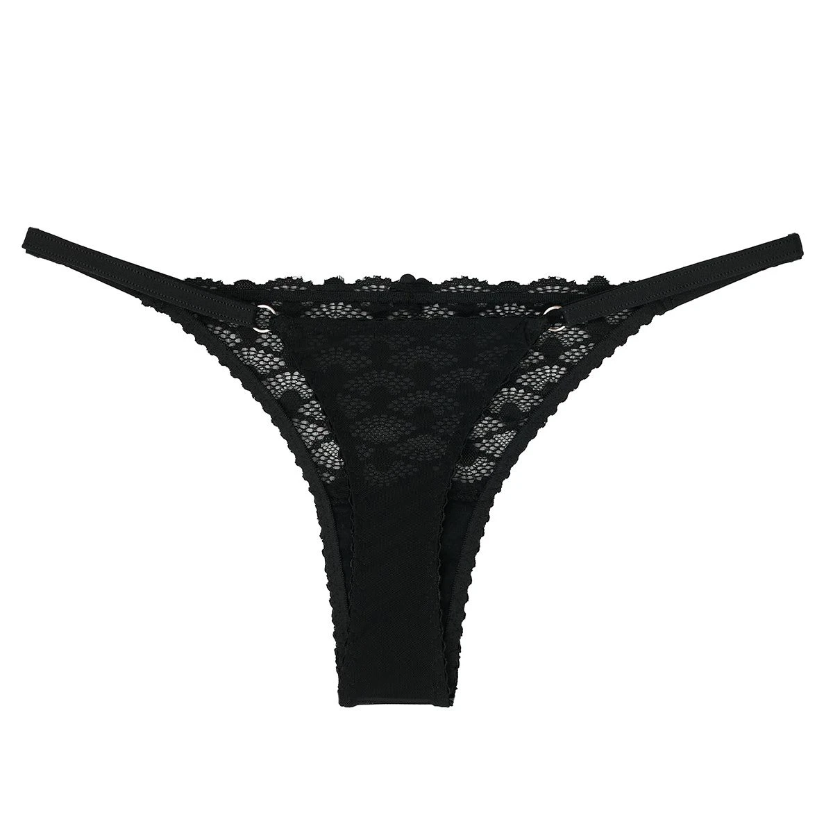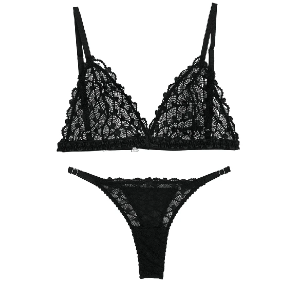 Conjunto de corpiño sin arco de encaje, los breteles son regulables. Microbikini less regulable, confeccionada en encaje.