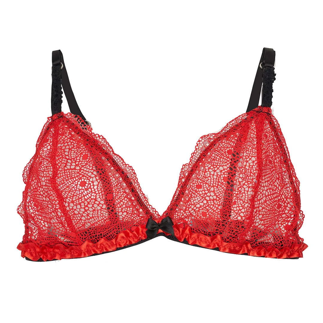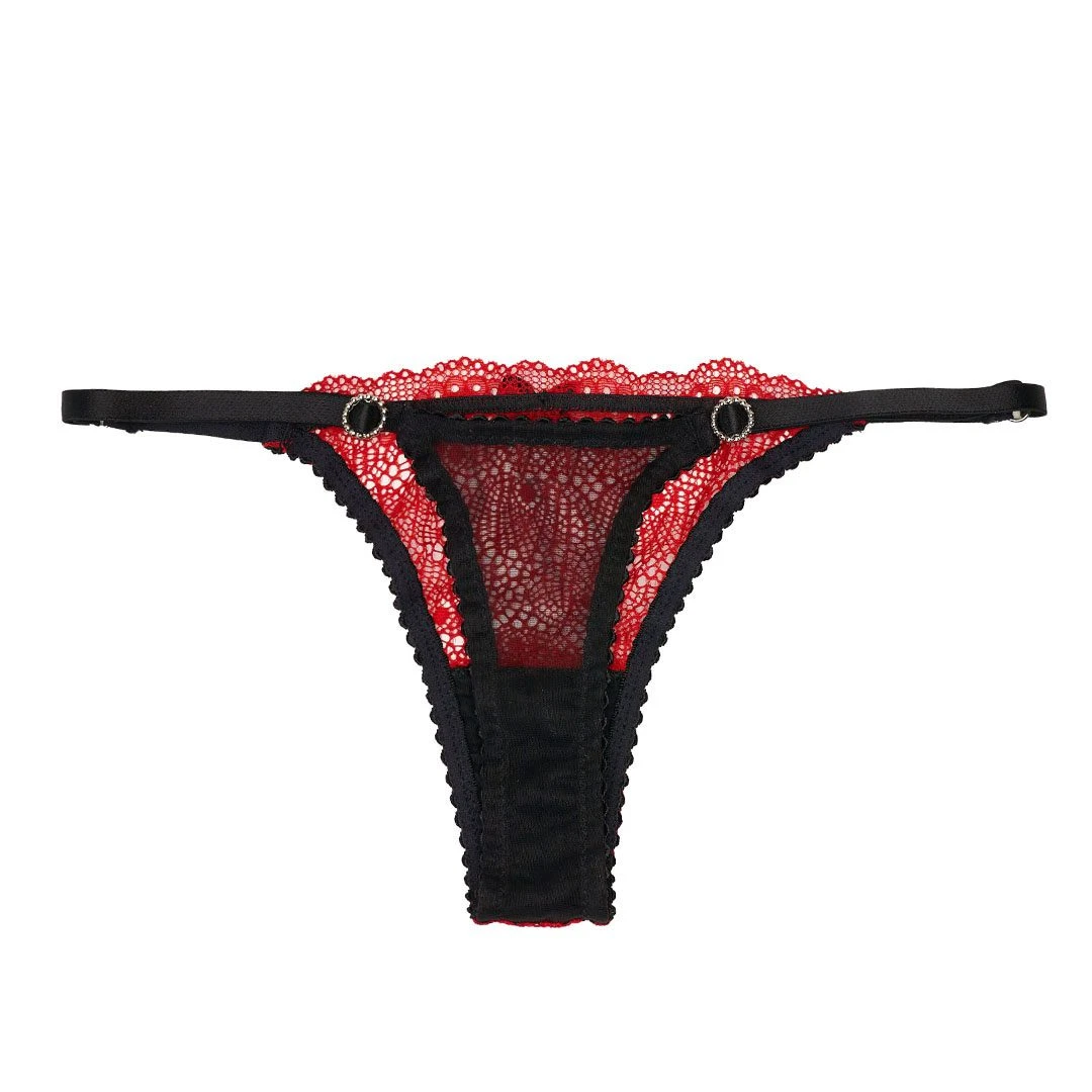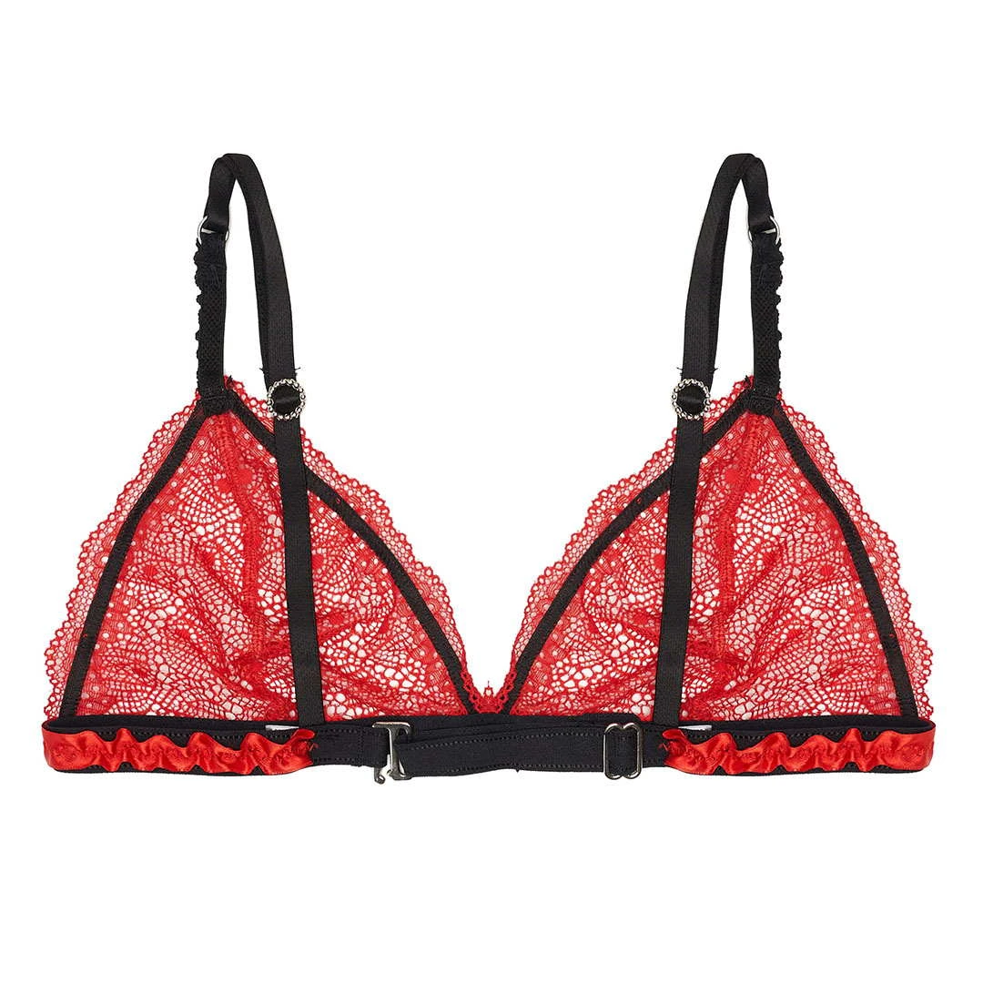 Conjunto de soutien triangulo en puntilla roja, súper cómodo y seductor! Detalle de puntillitas y mariposas . Espalda y breteles regulables. Lo acompaña hermosa microbikini regulable a tono.
