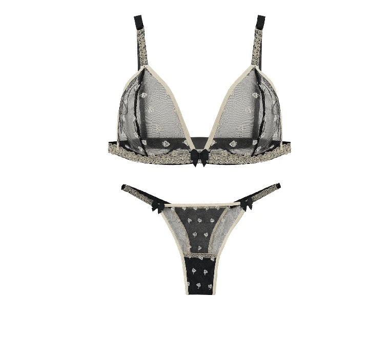 Nuestro conjunto de triángulo de plumeti negro, bordado con delicados corazones color hueso, es una obra maestra de elegancia y encanto. Los breteles regulables con frufrú de puntilla y la espalda ajustable aseguran un ajuste perfecto. Un coqueto moño adorna el centro del corpiño, añadiendo un toque de feminidad. La microbikini a juego, con los mismos breteles regulables y detalles de frufrú, completa este conjunto diseñado para hacerte sentir especial y segura de ti misma.