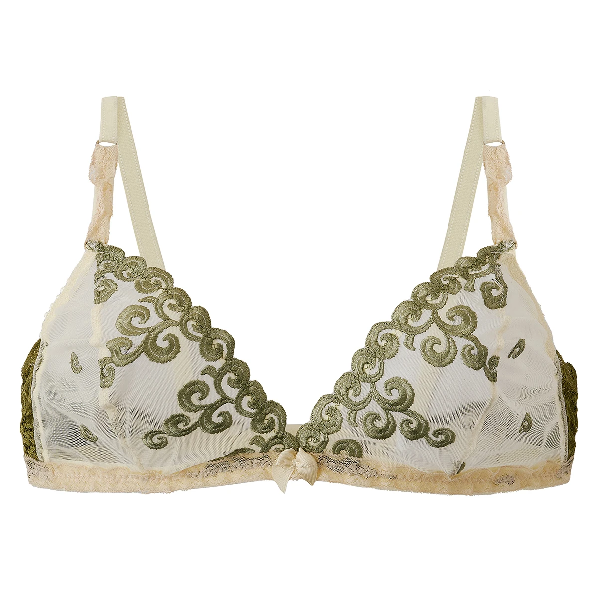 Este corpiño triángulo es la perfecta combinación de delicadeza y confort. Confeccionado en tul bordado estilo Broderie suizo y puntilla elastizada, envuelve tu piel con texturas suaves y elegantes que realzan tu feminidad.