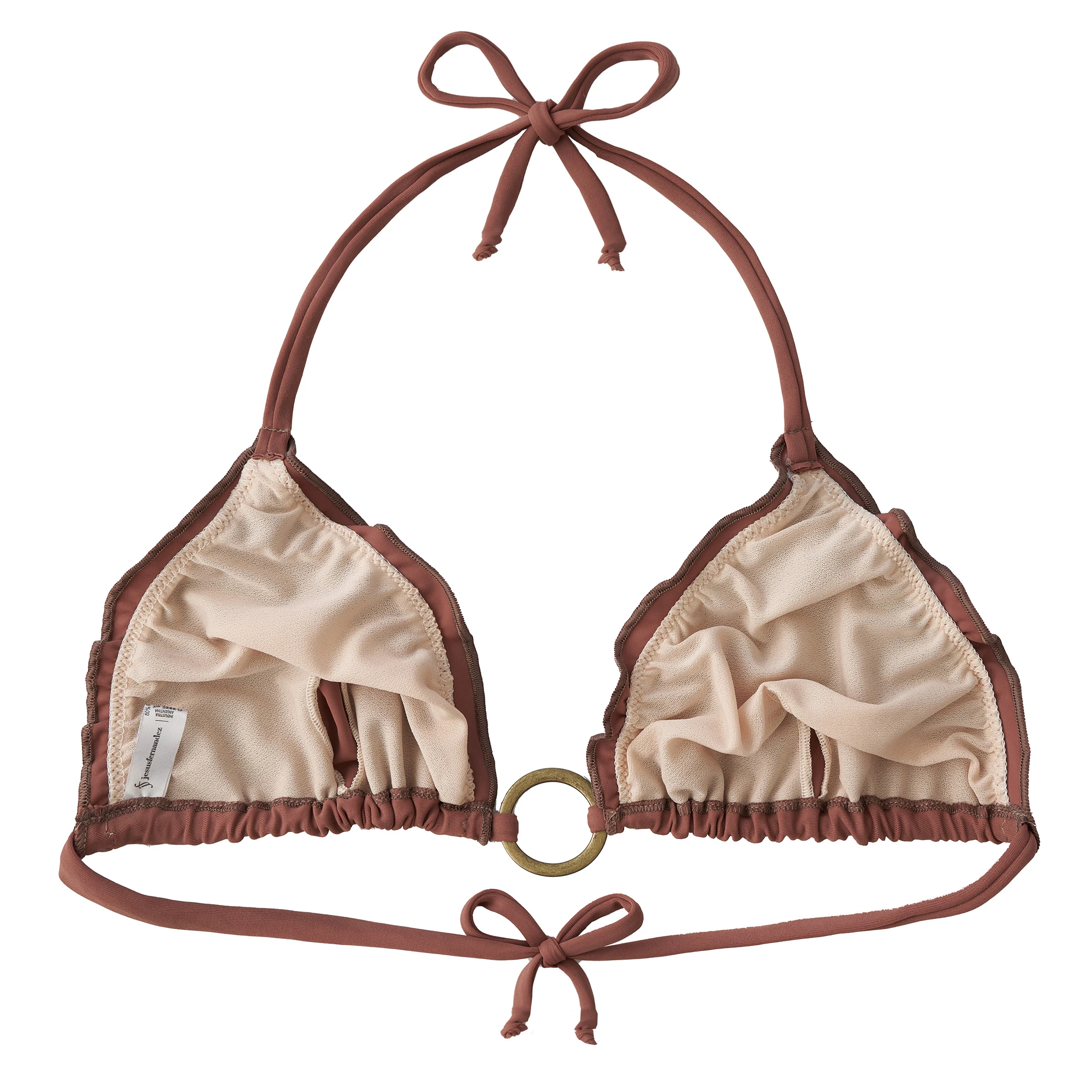 TRIANGULO TRAJE DE BAÑO CON TERMINACIÓN EN RULOTÉ Y DETALLE DE ARGOLLA EN TONO BRONCE