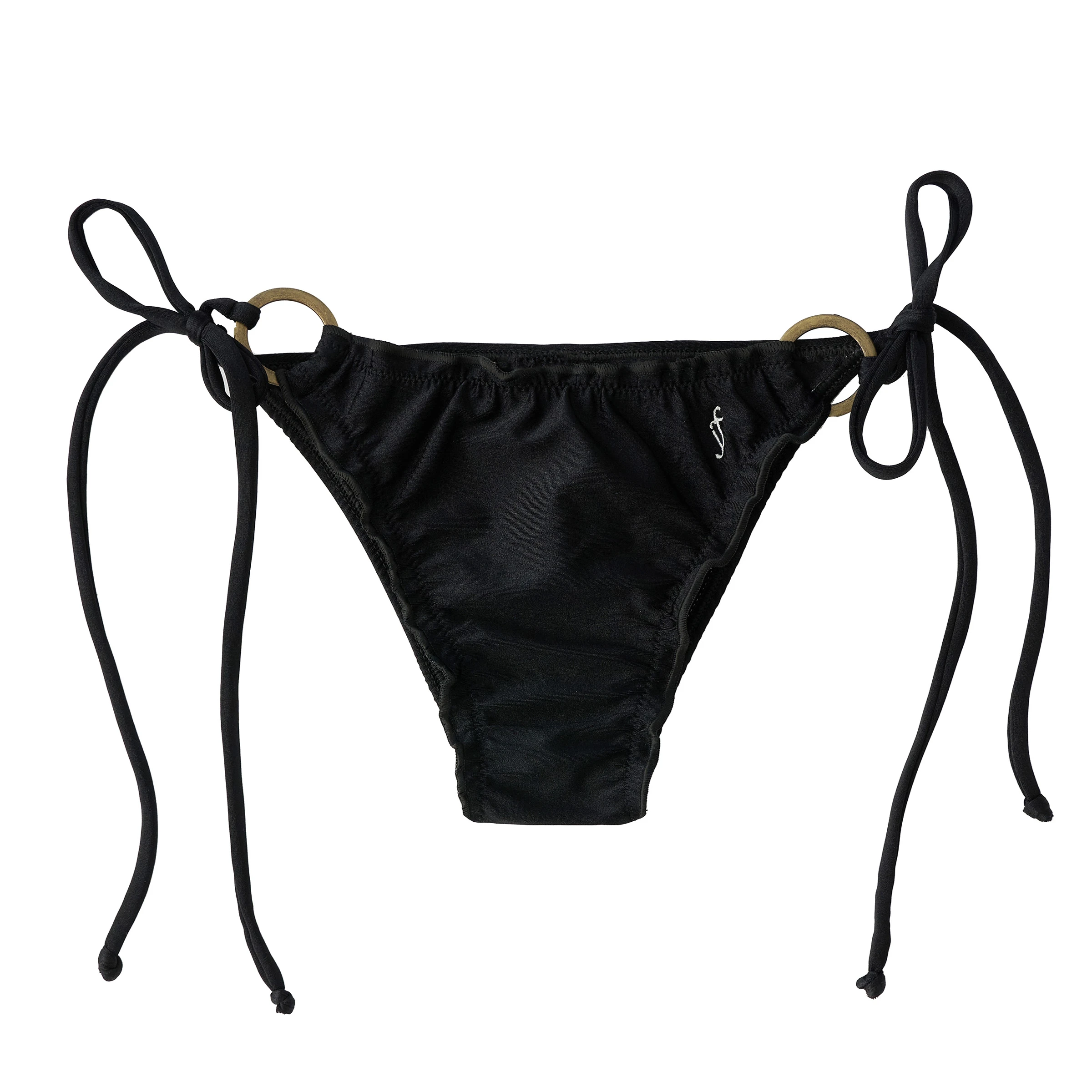 Bombacha bikini de traje de baño con terminación en ruloté y detalle de argollas en tono bronce.